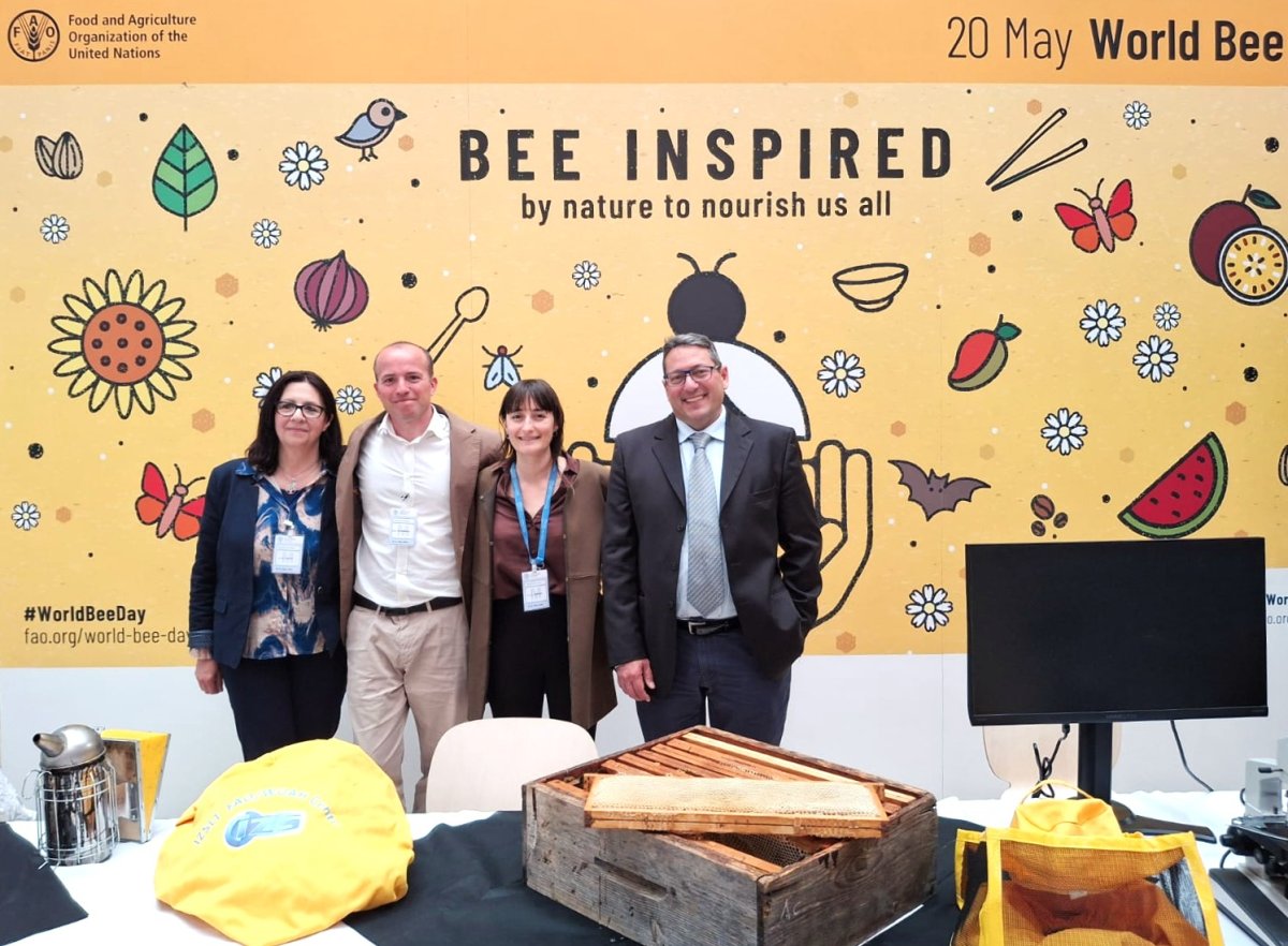 Nella foto il team IZSLT del laboratorio Produzioni e Patologia delle Api, Centro di Collaborazione WOAH in Apicoltura e FAO Reference Center celebra la Giornata Mondiale delle Api con la FAO ed @Apimondia